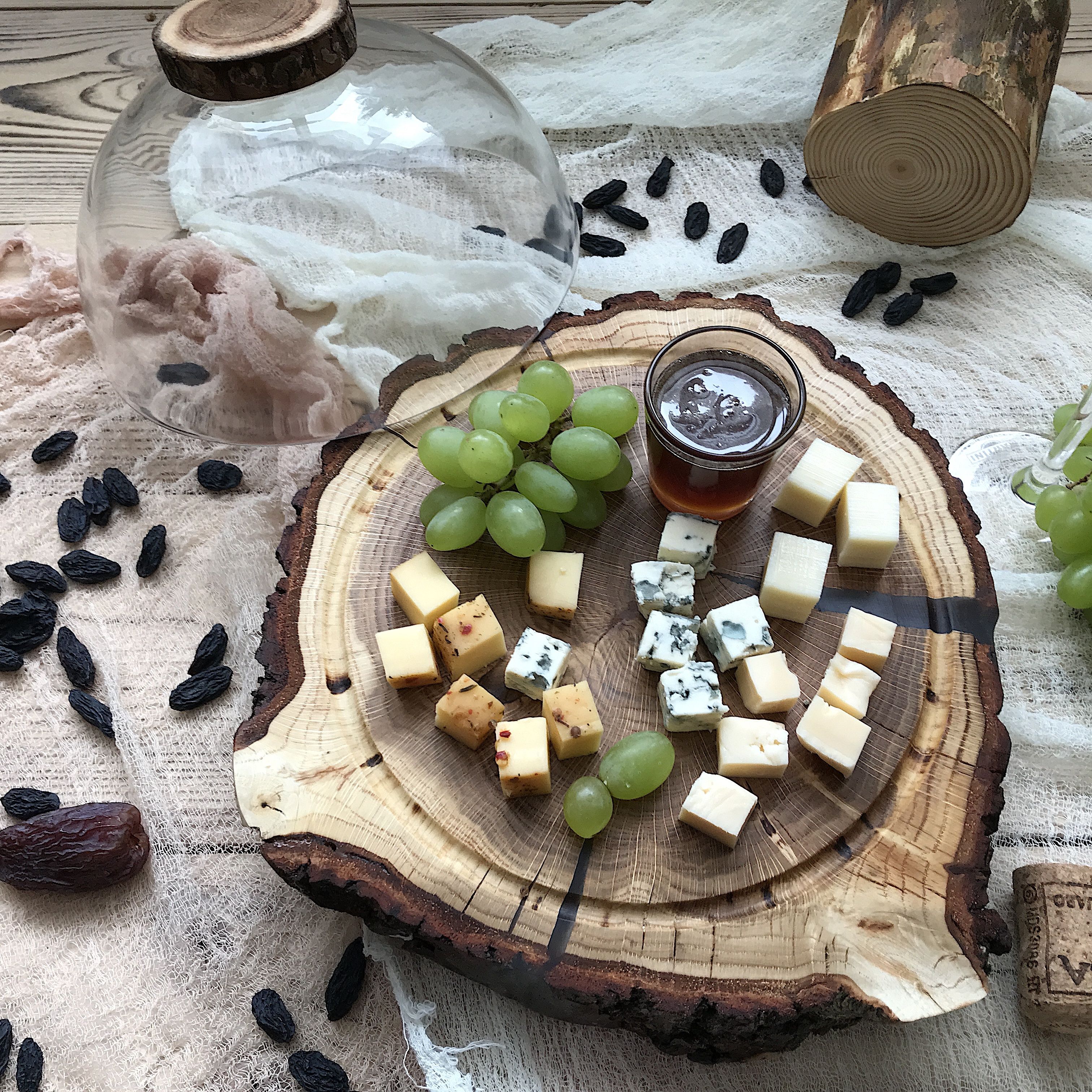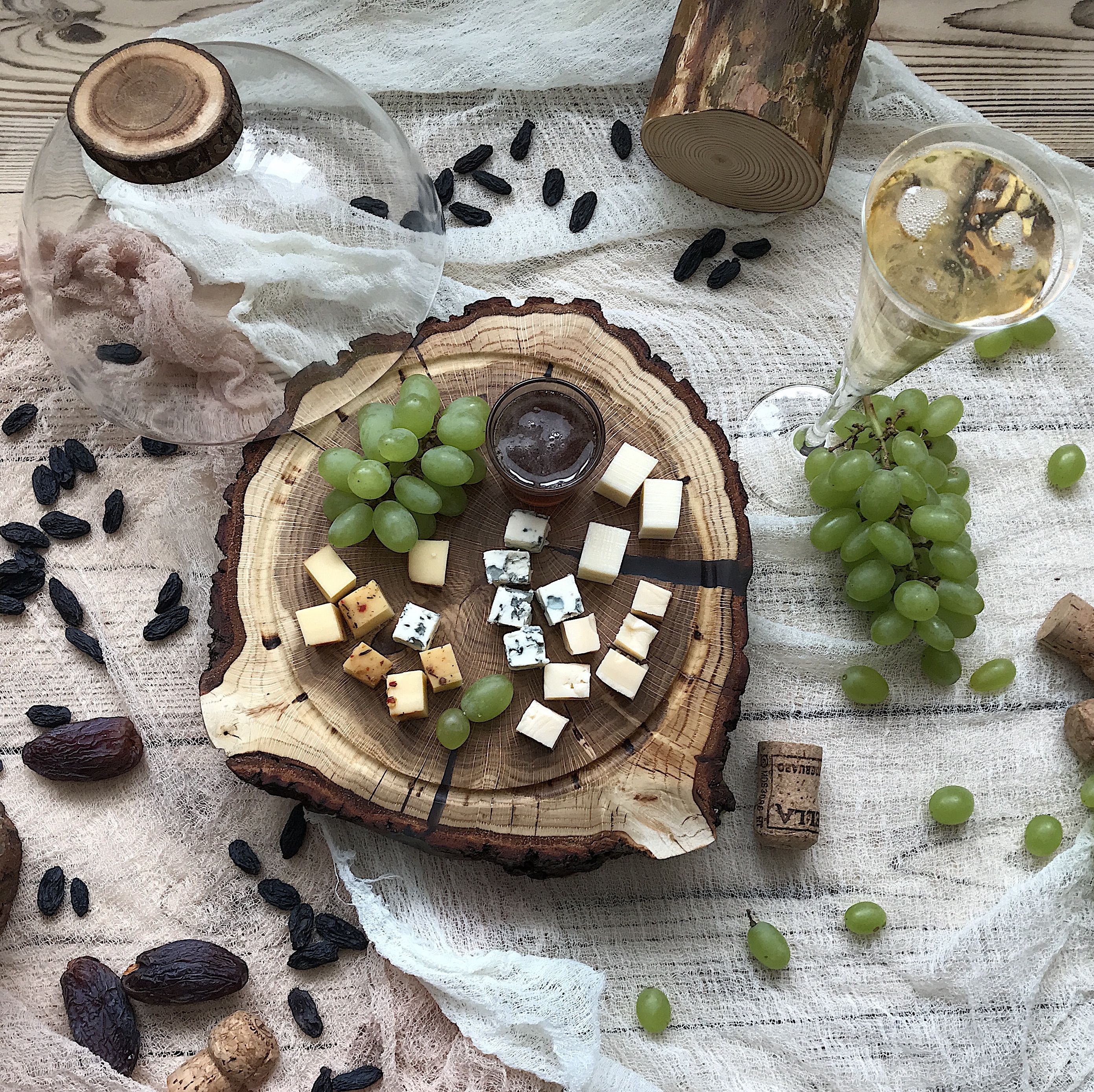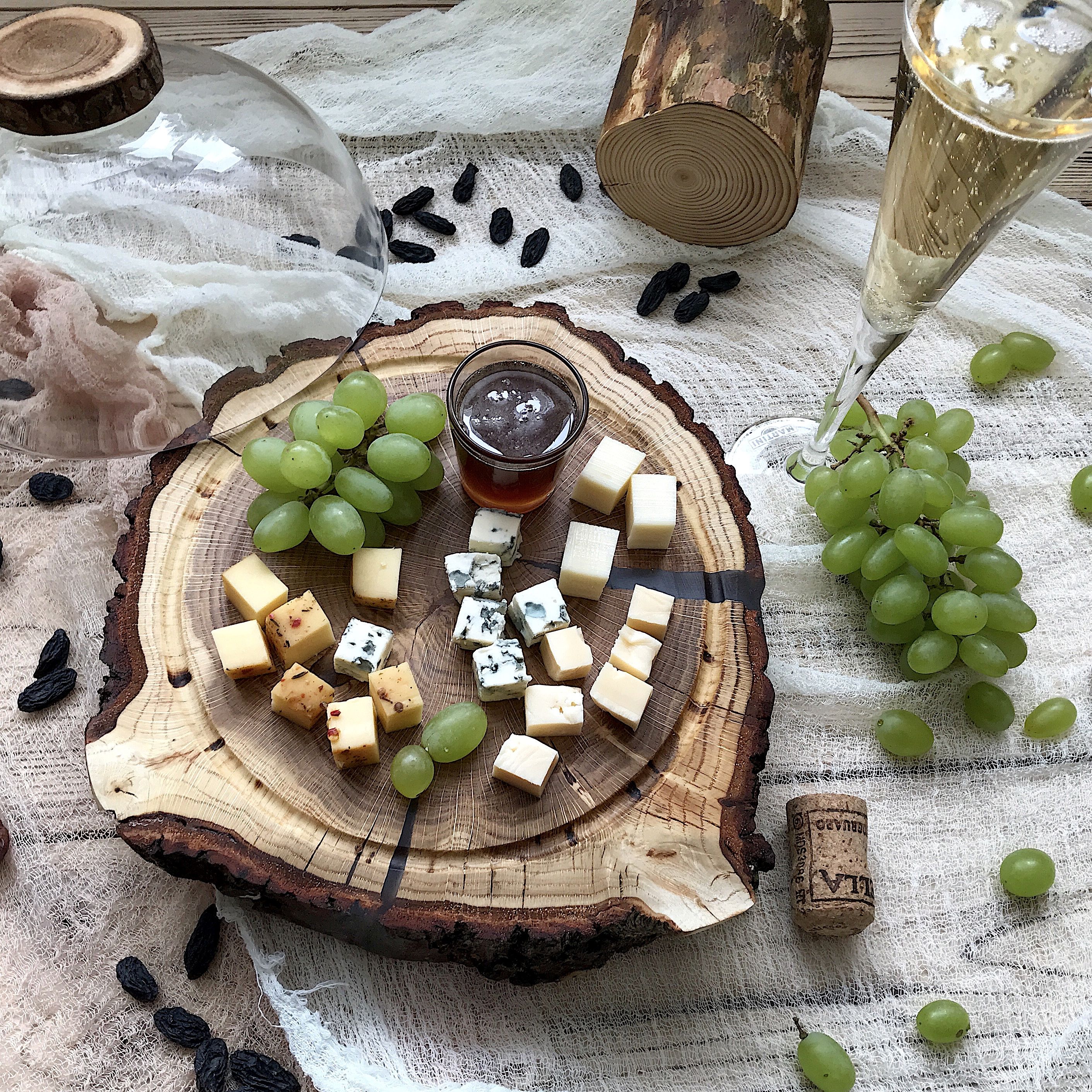 Идеален для оформления кондитерских витрин, подачи десертов на банкетах, организации чайного стола на свадьбах и праздниках. Также может быть использован для подачи холодных закусок, зелени, сыров. Фрезерованная канавка не даст соскользнуть клошу. Диаметр спила 24-26см., диаметр клоша 20см.
