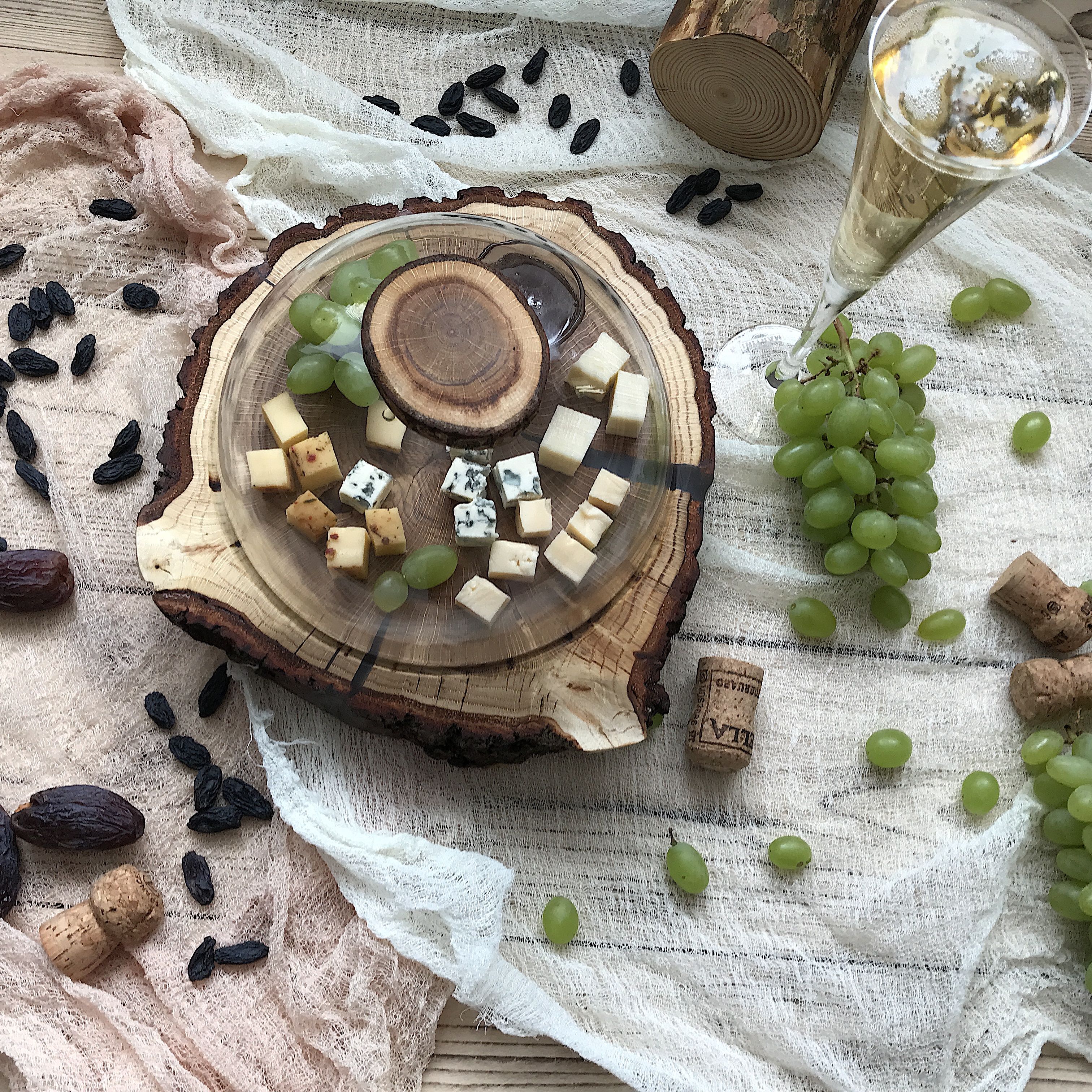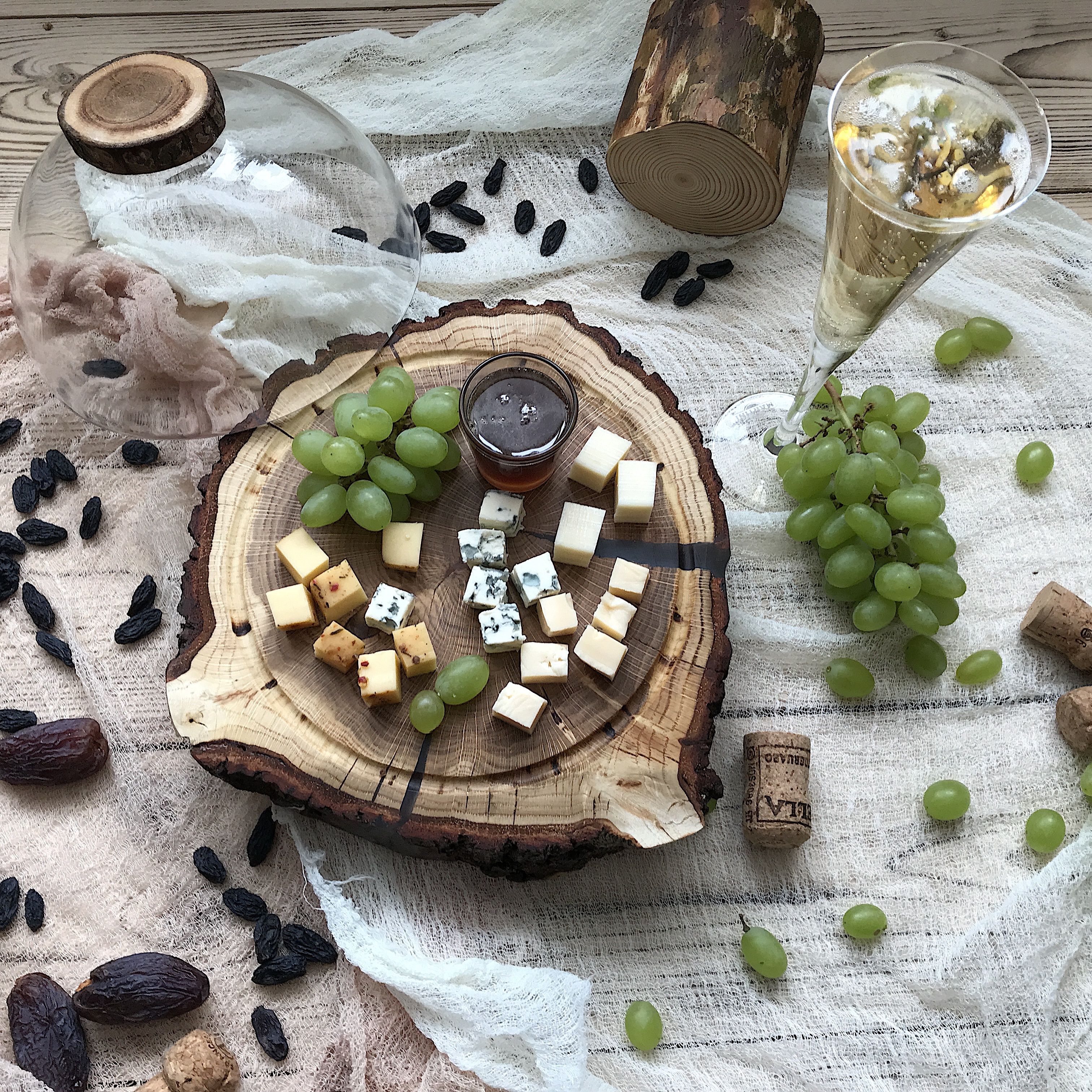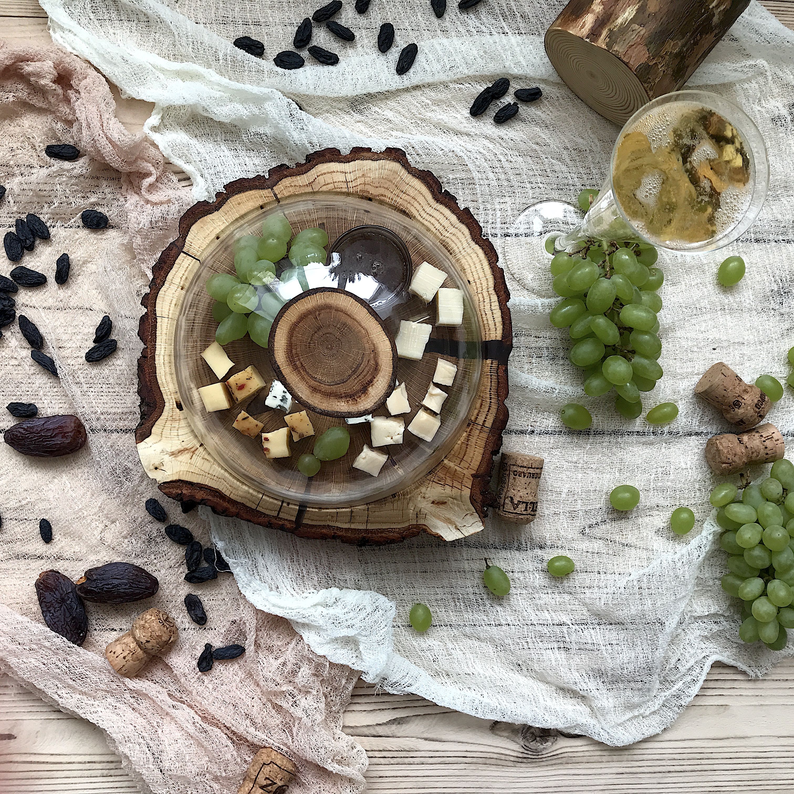Идеален для оформления кондитерских витрин, подачи десертов на банкетах, организации чайного стола на свадьбах и праздниках. Также может быть использован для подачи холодных закусок, зелени, сыров. Фрезерованная канавка не даст соскользнуть клошу. Диаметр спила 24-26см., диаметр клоша 20см.