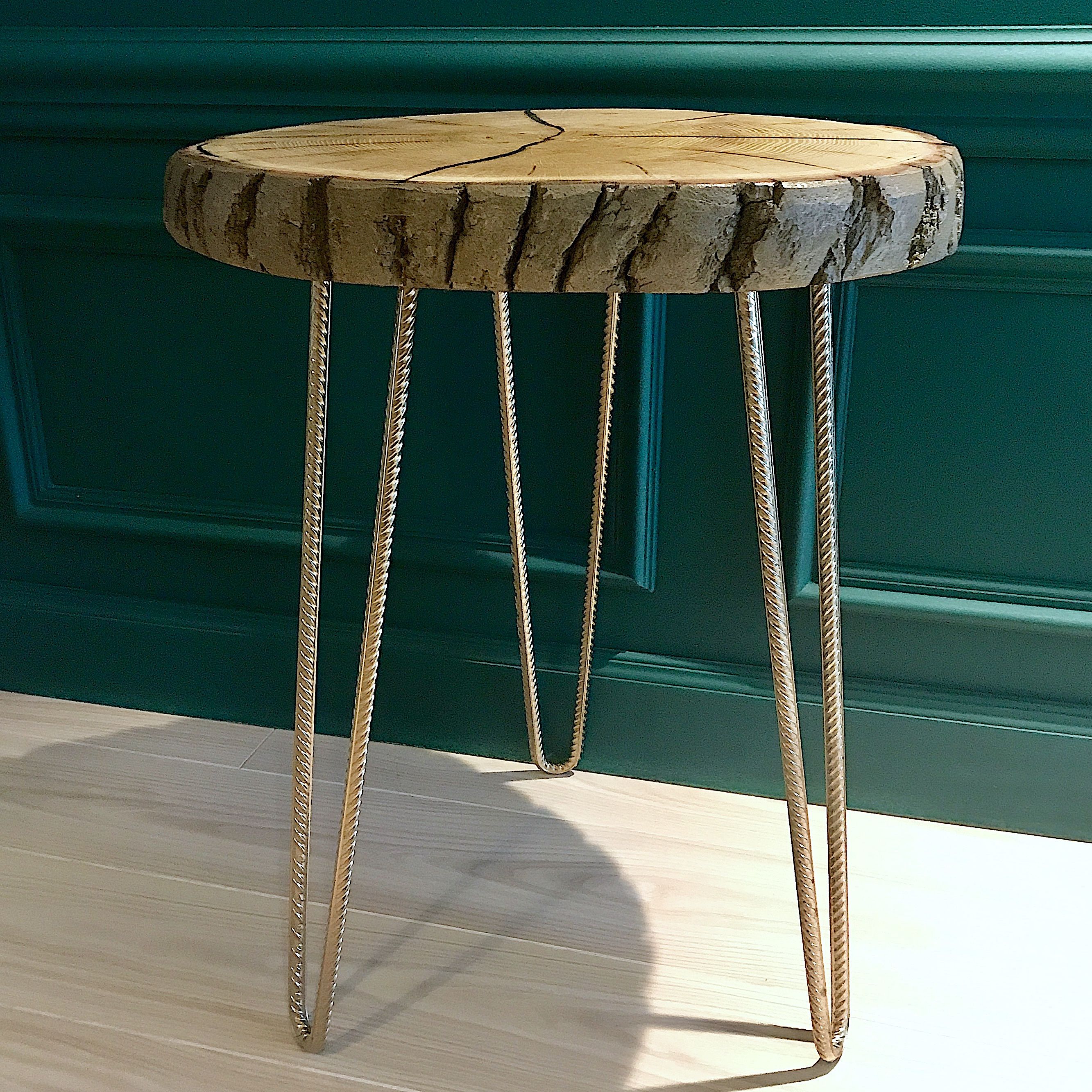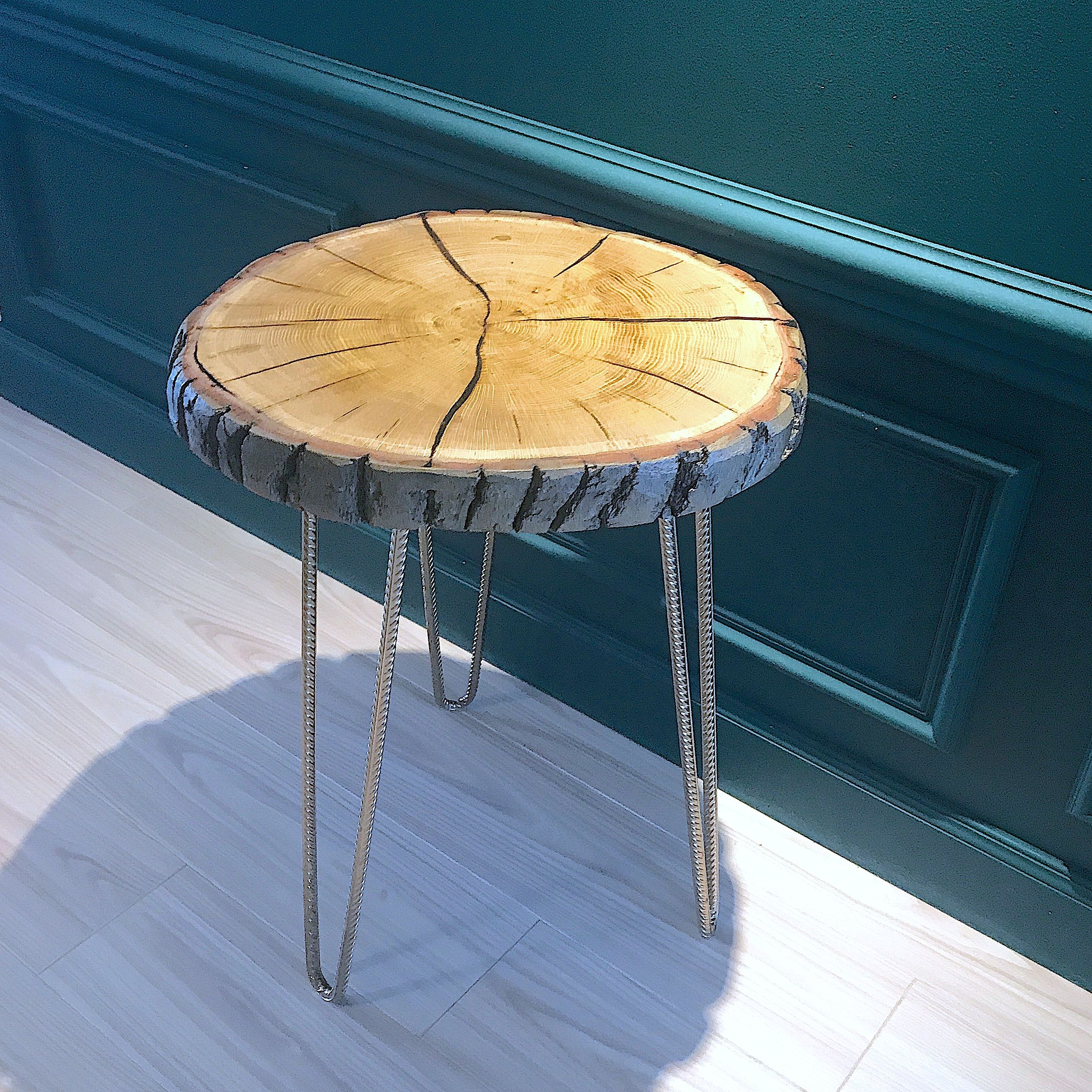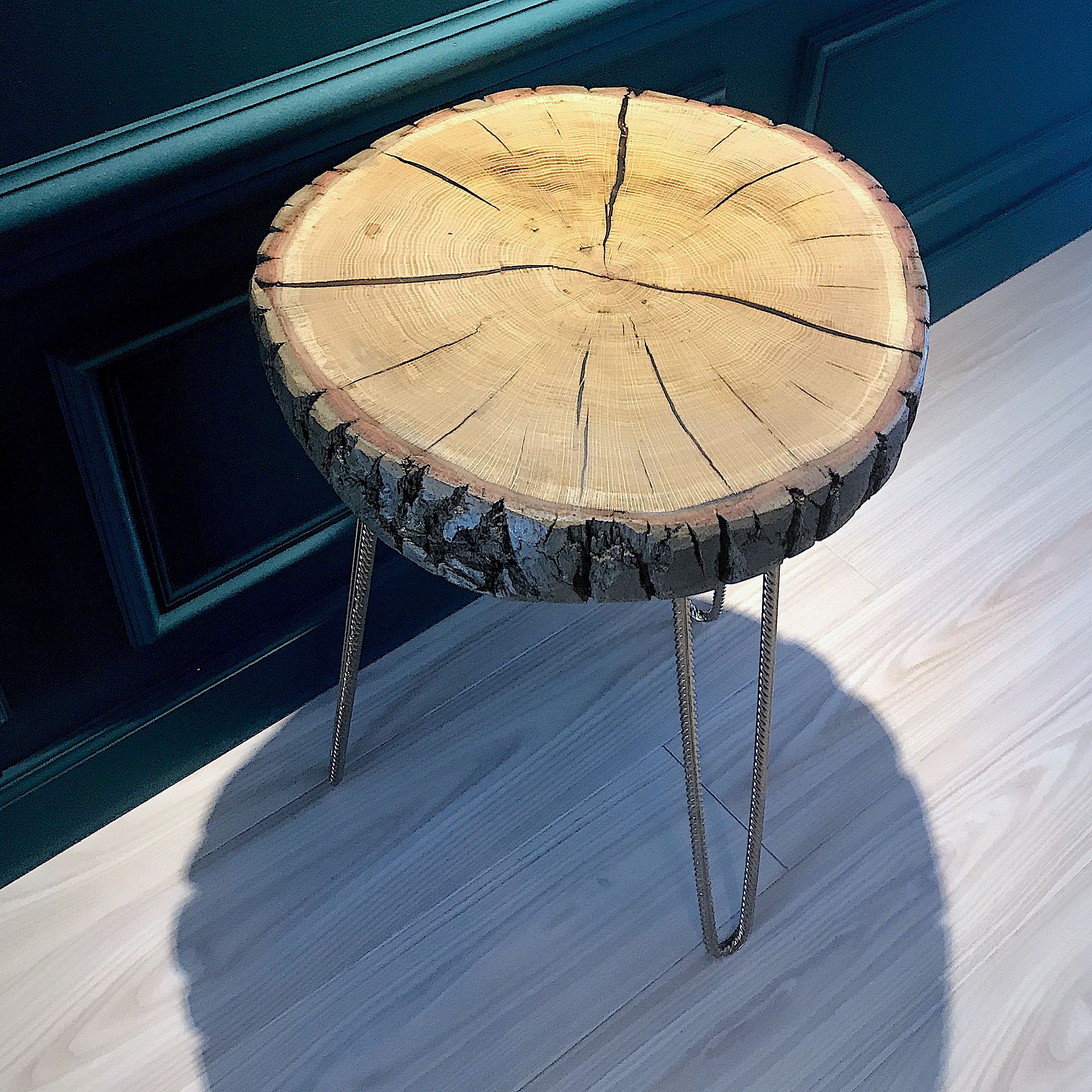 Столик из спила дуба с корой или без коры. Ножки золотые, черные, натурального цвета, белые. Диаметр 50см, толщина 4-5см.