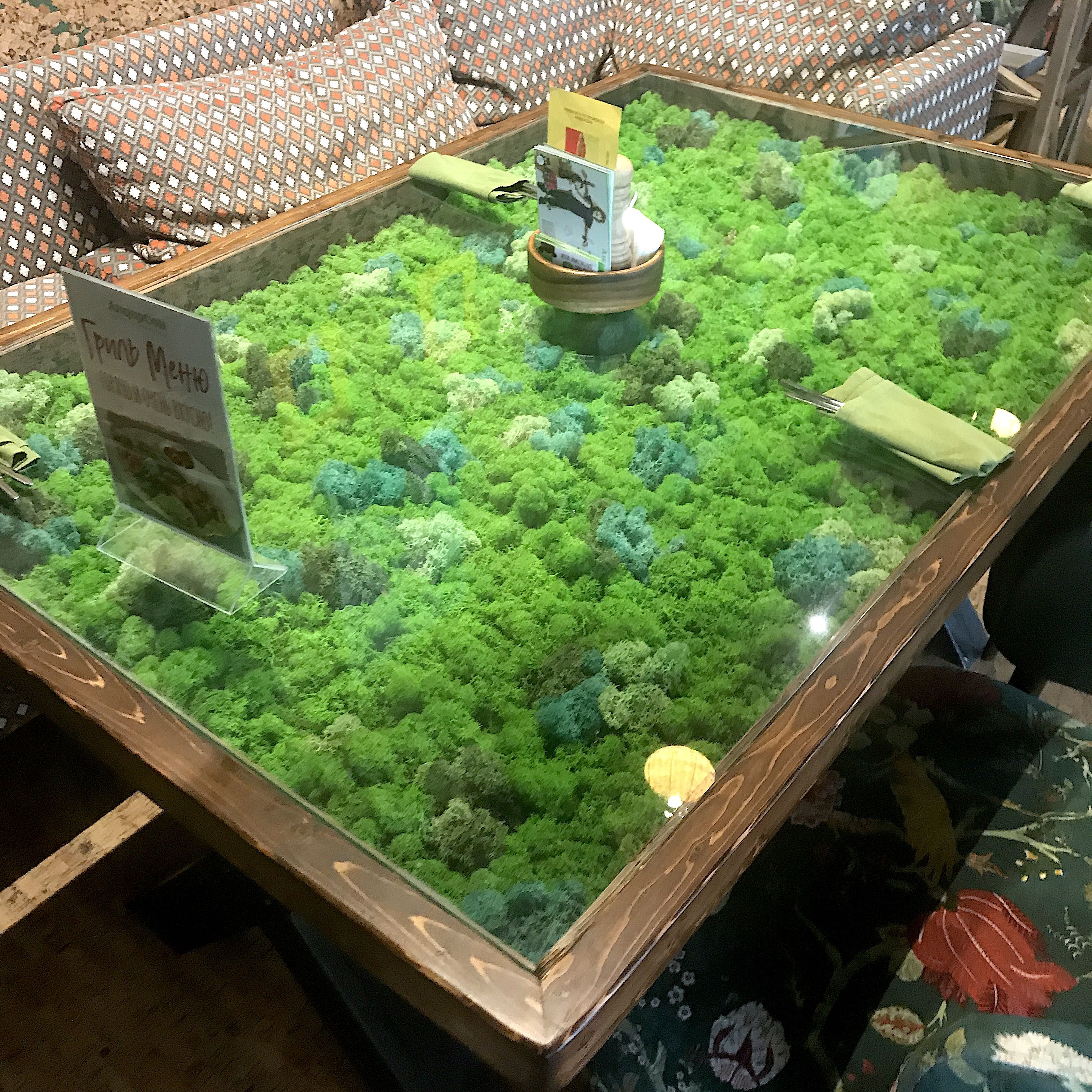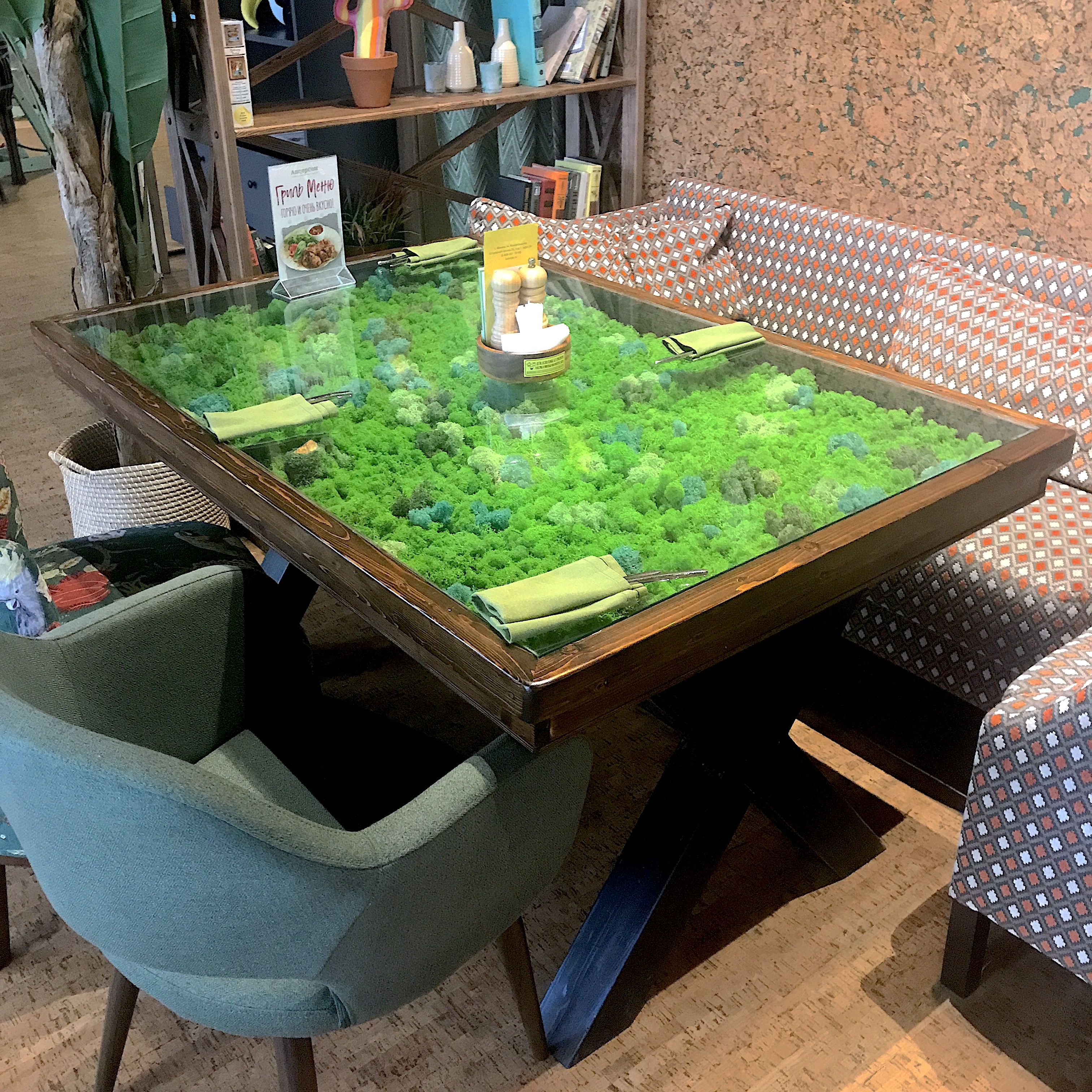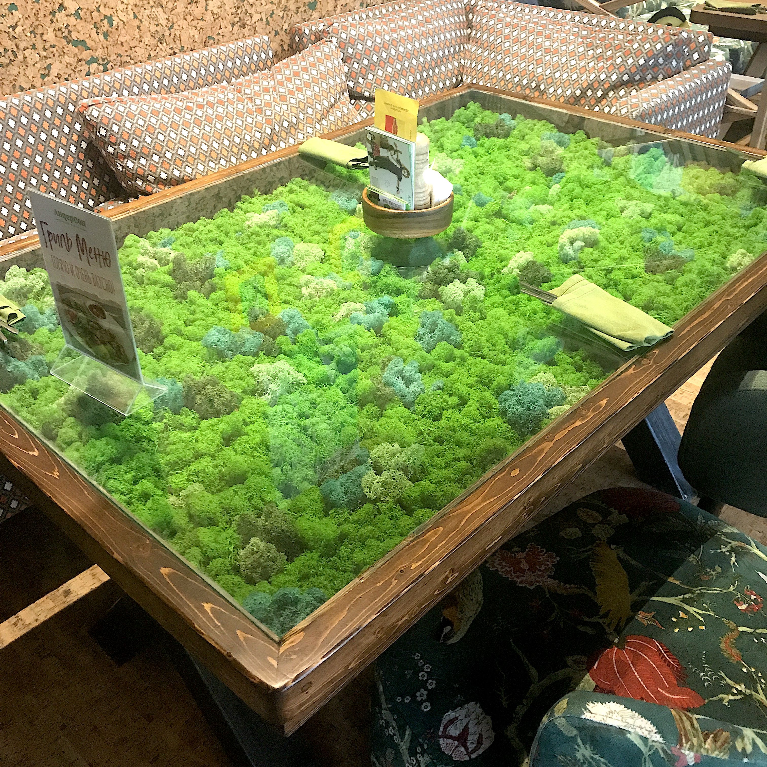 Стол из сосны, со стабилизированным мхом под стеклом. Изготавливается по вашим размерам, наполнение витрины может быть различным. Цена указана для размера 2000х800мм, каленое стекло 10мм.