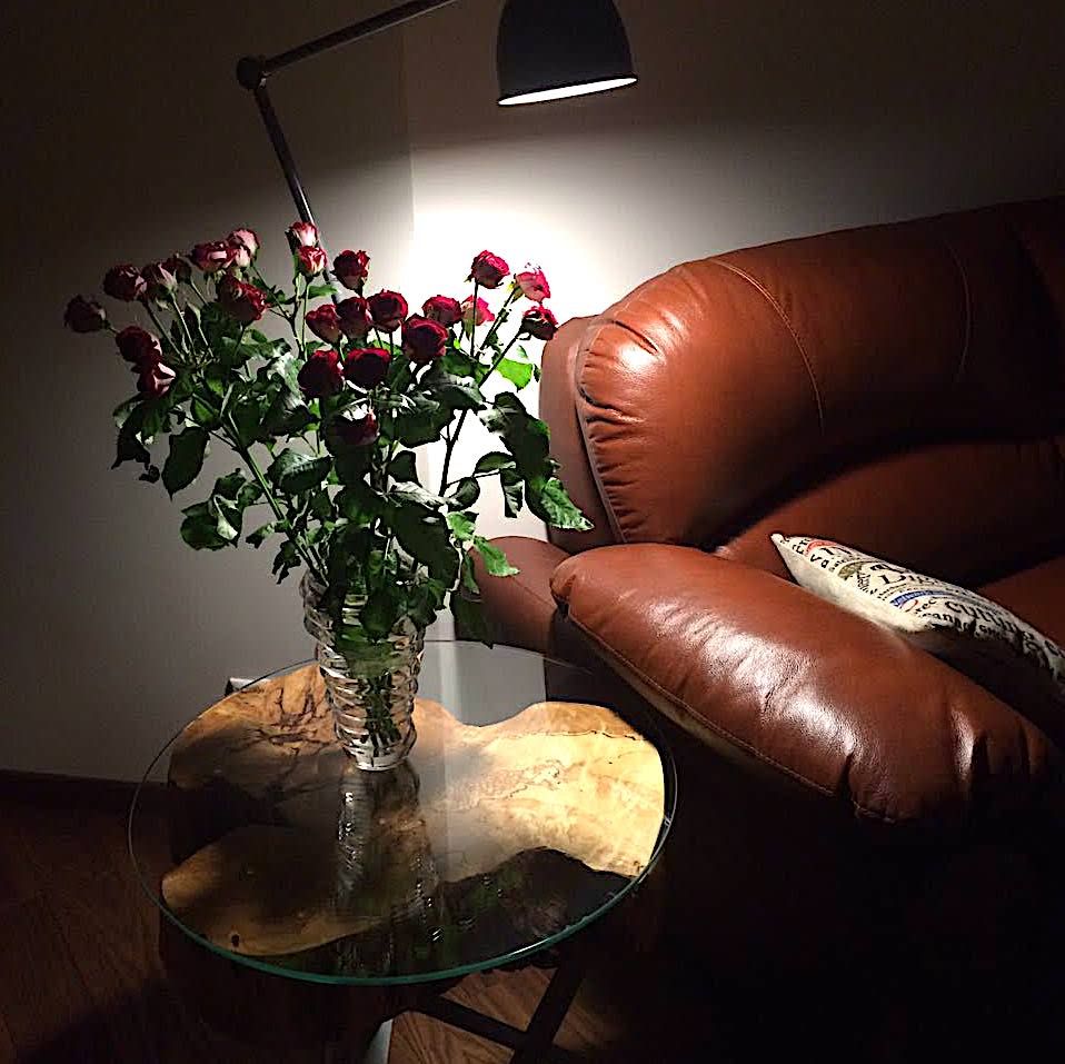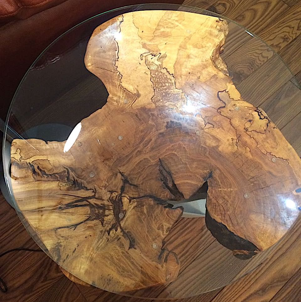 Стол из спила берёзового капа под калёным стеклом. В наличии около 30 спилов березы, тополя, белого тополя, дуба, мореного дуба. Ножки в любом цвете из металла, дерева, стекла.